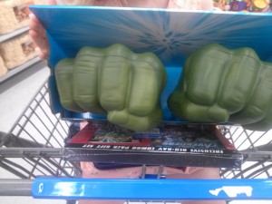 We went off in search of the character displays and quickly found out that our Walmart didn’t have the displays. The kids and I were disappointed because we wanted to see the cool stuff but we found other fun;). We decided to wander around and check out the toys. I think the Hulk hands were the big hit. I still am wondering if they would fit me;). I mean, I can be angry for Halloween.