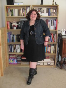 This is an outfit that I wore on TV back on February 3rd. It is a simple black, knit dress with a faux belt. I love these slouchy black boots because they are flat!!! And of course I am wearing my standard denim jacket (best find ever). I am not sure about the denim on the black but the sleeves are just cap sleeves so I need something over it! Oh, I picked up that dress for just $14 from Ross!
