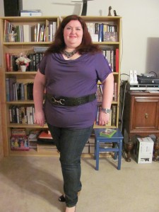 And this is what I wore yesterday. The belt is my new acquisition. I picked it up over at Lane Bryant and I think it helps camouflage the belly. But I am just not sure about the over all look. And I will not be taking those 3 inch wedges to Blissdom;). But I am super comfy in that roomie purple shirt and the skinny jeans are slimming, right? (Am I just fooling myself?)