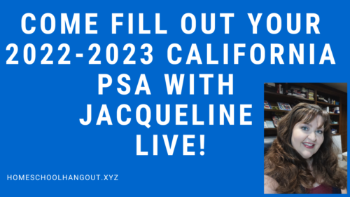 Is this your first time filling out the California PSA for independent homeschoolers? Have you filed before but have wished you could have someone to ask the random questions you think of? Would you like to have me right beside you as you fill out your PSA for this year? For $10 you can! I have 2 different live streams scheduled. But don’t delay, I am limiting sign-ups to 75 for each one!