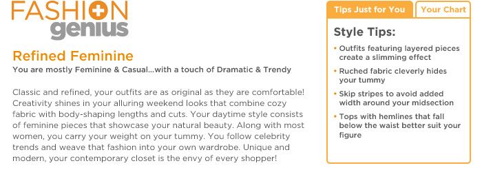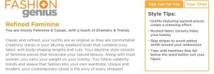 And that is just about pants!!! There are similar statistics about all the other types of clothes too! But that is where Fashion Genius kicks in. They have a 3 minute quiz that helps us to find the perfect clothes! And this isn’t just based on whim but it is based on an algorithm developed with over 70 million data points of information (yes, I am getting my geek on;).