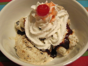 Then the kids had fun picking out extras! It is funny how everyone has a different list of must haves. NerdDad wants waffle bowls and chocolate syrup. The kids are all about sprinkles, whipped cream and cherries. But you can always find something for everyone! And I love the fact that I can use all those ingredients not only in sundaes but in other desserts too! Have you had frosting flavored by cherry juice? Yum.