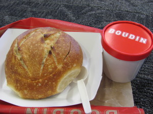 So while SFO has wifi and no where to sit while plugged in. So I had to sit on the ground against the wall while working and eating my lunch (no, not bitter). The up side, the Boudin stop in the food court! I found that if you get it to go you get them like this. The awesome part is that they came separately, that way I could actually dunk my entire bowl into my broccoli cheese soup!